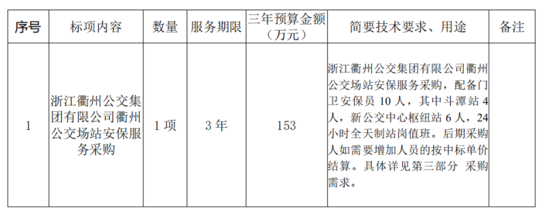 二、項(xiàng)目名稱:浙江衢州公交集團(tuán)有限公司衢州公交場(chǎng)站安保服務(wù)采購(gòu)項(xiàng)目