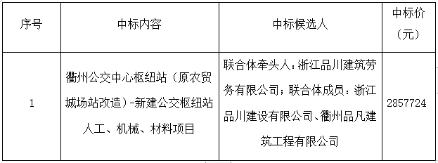 根據(jù)《中華人民共和國(guó)招標(biāo)投標(biāo)法》等有關(guān)法律法規(guī)的規(guī)定,浙江建安工程管理有限公司受浙江衢交建設(shè)工程有限公司委托,對(duì)其衢州公交中心樞紐站(原農(nóng)貿(mào)城場(chǎng)站改造)-新建公交樞紐站人工、機(jī)械、材料項(xiàng)目采用公開(kāi)招標(biāo)方式進(jìn)行招標(biāo)。浙江建安工程管理有限公司于2021年6月17日09時(shí)30分在衢州市交通投資集團(tuán)二樓開(kāi)標(biāo)廳(衢州市柯城區(qū)白云街道花園中大道86號(hào))進(jìn)行開(kāi)評(píng)標(biāo)。評(píng)標(biāo)結(jié)果及相關(guān)事宜現(xiàn)公示如下: