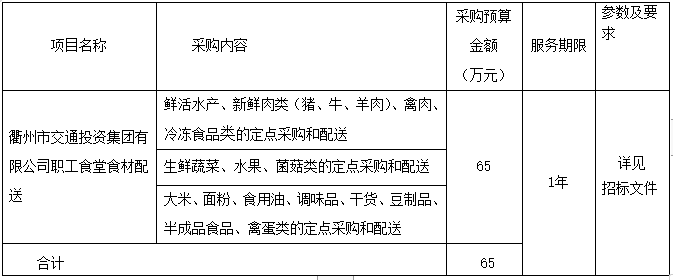 參照《中華人民共和國政府采購法》、《政府采購貨物和服務招標投標管理辦法》等規(guī)定,浙江中信工程咨詢有限公司受衢州市交通投資集團有限公司委托,就衢州市交通投資集團有限公司職工食堂食材配送采購項目進行公開招標,歡迎國內(nèi)合格的供應商前來投標。