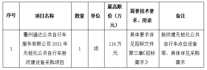 項(xiàng)目名稱:衢州通達(dá)公共自行車服務(wù)有限公司2021年無樁化公共自行車新改建設(shè)備采購項(xiàng)目