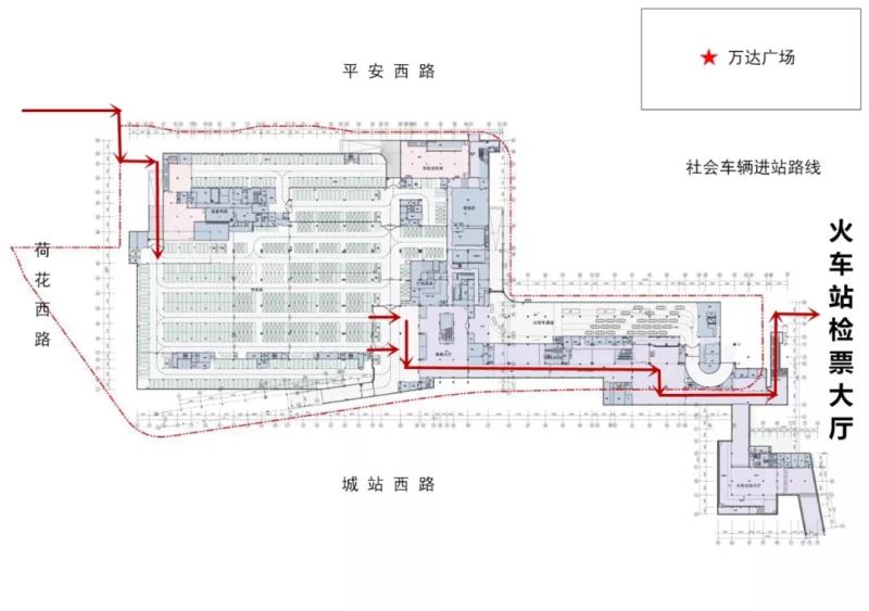 旅客從鐵路出站閘機口走出,右轉(zhuǎn)后步行20米左轉(zhuǎn),經(jīng)過第一、第二換乘大廳抵達停車場具體停車位上車后,車輛即可根據(jù)停車場內(nèi)的標識標志,沿著車道由東向西從城站西路駛出。