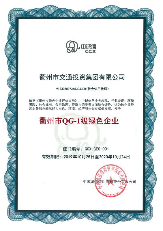 10月25日,衢州交通投資集團(tuán)成功獲評QG-1級最高綠色企業(yè)等級。中國誠信信用管理股份有限公司嚴(yán)格按照中國人民銀行衢州市中心支行發(fā)布的《綠色信貸情況統(tǒng)計(jì)表》,衢州市金融工作辦公室、中國人民銀行衢州市中心支行、中國銀監(jiān)會衢州監(jiān)管分局和衢州市質(zhì)量技術(shù)監(jiān)督局聯(lián)合發(fā)布的衢金融發(fā)〔2018〕10號文(即關(guān)于印發(fā)《衢州市綠色企業(yè)評價(jià)方法》《衢州市綠色項(xiàng)目評價(jià)方法》的通知)等相關(guān)文件要求進(jìn)行評級,該企業(yè)評級結(jié)果得到中國綠金委和環(huán)境保護(hù)部等相關(guān)部門高度認(rèn)可。