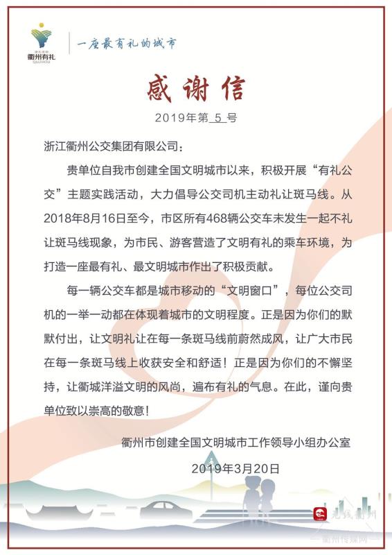 市交通投資集團(tuán)有限公司副總經(jīng)理葉建國表示,“這封感謝信讓我們倍感驚喜和意外,我們將繼續(xù)通過有禮公交的打造,宣傳衢州有禮的品牌形象,制定更嚴(yán)密的措施,為創(chuàng)建全國文明城市添磚加瓦。”