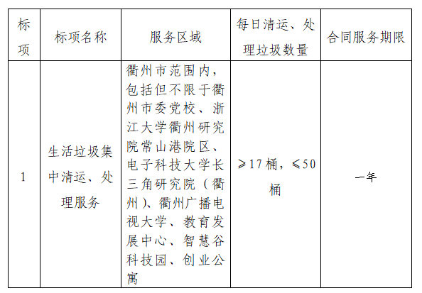 一、采購項(xiàng)目名稱:衢州市瑞城科技產(chǎn)業(yè)服務(wù)有限公司運(yùn)營(yíng)區(qū)域生活垃圾集中清運(yùn)、處理服務(wù)采購。