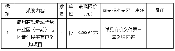參照《衢州市國(guó)有企業(yè)采購(gòu)管理辦法(試行)》等規(guī)定,衢州市智信工程咨詢有限公司受衢州市智慧產(chǎn)業(yè)投資發(fā)展有限公司的委托,就衢州高鐵新城智慧產(chǎn)業(yè)園(一期)北區(qū)部分樓宇窗簾采購(gòu)項(xiàng)目進(jìn)行詢價(jià),本項(xiàng)目為非依法必招項(xiàng)目,現(xiàn)請(qǐng)合格供應(yīng)商參加投標(biāo)。