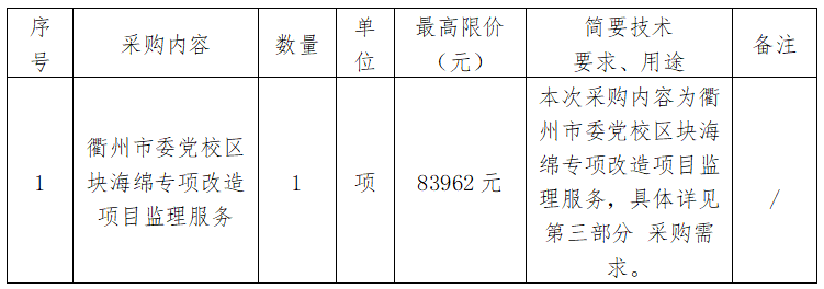 根據(jù)《衢州市國有企業(yè)采購管理辦法(試行)》規(guī)定并參照《中華人民共和國招標(biāo)投標(biāo)法》、《中華人民共和國政府采購法》等有關(guān)規(guī)定,衢州市兩山工程咨詢管理有限公司受衢州市智慧產(chǎn)業(yè)投資發(fā)展有限公司的委托,對衢州市委黨校區(qū)塊海綿專項(xiàng)改造項(xiàng)目監(jiān)理服務(wù)進(jìn)行詢價(jià)采購,歡迎準(zhǔn)時(shí)參加。