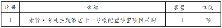 一、采購項目名稱:崇賢·有禮主題酒店十一號樓配置紗窗項目