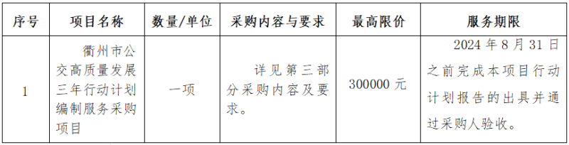 受浙江衢州公交集團(tuán)有限公司委托,現(xiàn)就衢州市公交高質(zhì)量發(fā)展三年行動(dòng)計(jì)劃編制服務(wù)采購項(xiàng)目進(jìn)行采購。本項(xiàng)目以競(jìng)爭(zhēng)性磋商方式進(jìn)行采購,歡迎合格的供應(yīng)商參加。