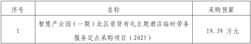 一、采購項(xiàng)目名稱:智慧產(chǎn)業(yè)園(一期)北區(qū)崇賢·有禮主題酒店臨時(shí)勞務(wù)服務(wù)定點(diǎn)采購。