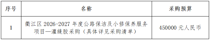 一、項(xiàng)目名稱:衢江區(qū)2026-2027年度公路保潔及小修保養(yǎng)服務(wù)項(xiàng)目——灌縫膠采購(gòu)