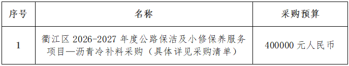 根據(jù)《衢州市市屬國有企業(yè)采購管理辦法(試行)》規(guī)定,以公開詢價方式對衢江區(qū)2026-2027年度公路保潔及小修保養(yǎng)服務(wù)項(xiàng)目施工所需瀝青冷補(bǔ)料進(jìn)行采購,歡迎合格的供應(yīng)商參加。
