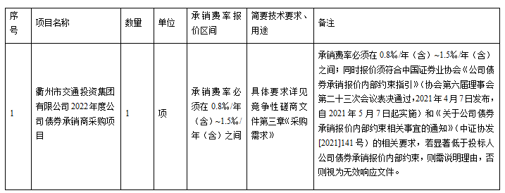 項目名稱:衢州市交通投資集團有限公司2022年度公司債券承銷商采購項目