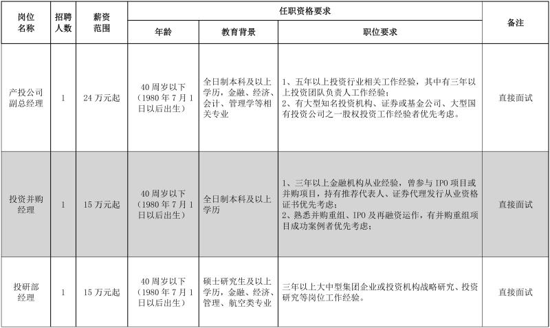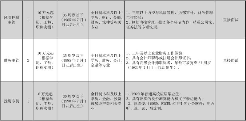 2、產(chǎn)投公司副總經(jīng)理、投資并購經(jīng)理、投研部經(jīng)理、風險控制主管、財務(wù)主管五個崗位采用直接面試形式,報名人員通過資格審查后進入面試環(huán)節(jié)。