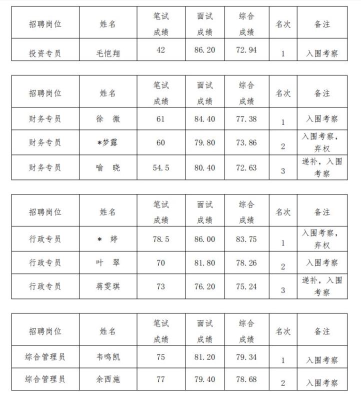 根據(jù)《衢州市交通投資集團(tuán)有限公司招聘工作人員公告》,現(xiàn)將入圍考察人員的名單公布如下: