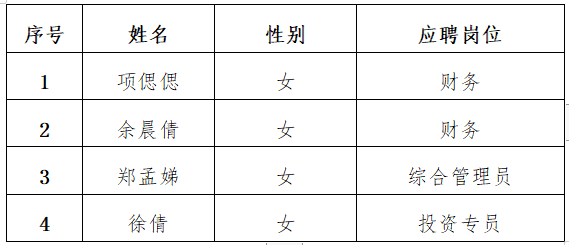 根據(jù)《衢州市交通投資集團(tuán)有限公司招聘工作方案》要求,現(xiàn)將擬錄用人員名單公示如下: